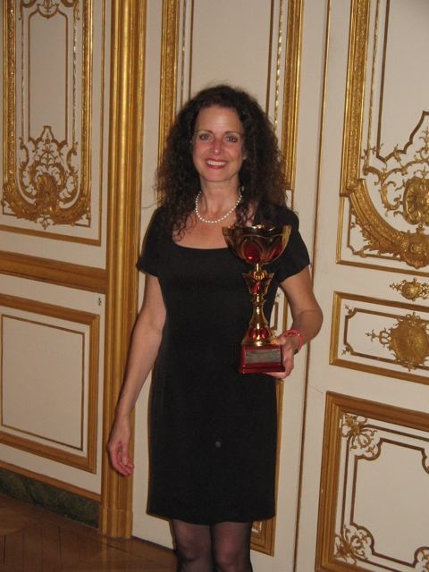 Left, Jane with her 1st Place Trophy for Best Humorous Speech at the October 2009 regional Area B4 Toastmasters Contest in Paris, held at the exceptional location of the Irish Embassy.